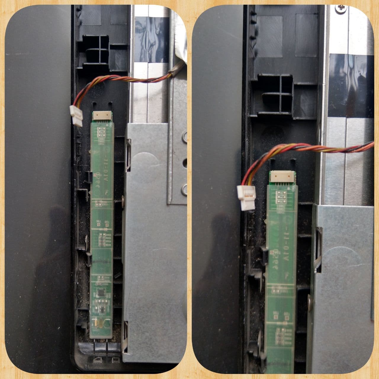 اتصالات لامپ CCFL بکلایت را از بُرد پاور جدا نمایید - با دقت اتصال کابل LVDS (کابل اتصال مین برد به صفحه نمایش و T-CON ) را با کمک دو پین فشاری جانبی کابل آزاد نمایید.