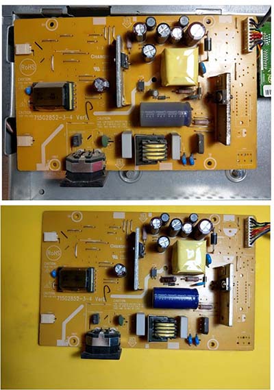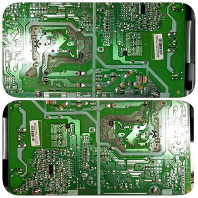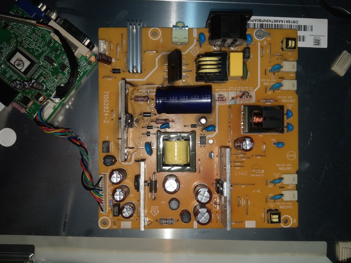 تصویر زیر برد پاور POWER مانیتور AOC مدل 2436SWA را نشان میدهد که خط سفید روی برد نشان دهنده مرز بین COLD و HOT را مشخص می کند. مشخص است این برد پاور برای مانیتور با صفحه نمایش 4 لامپ مهتابی فلورسنت CCFL طراحی شده است و از یک سلف چُک برای تامین ولتاژ بالای AC استفاده می شود.