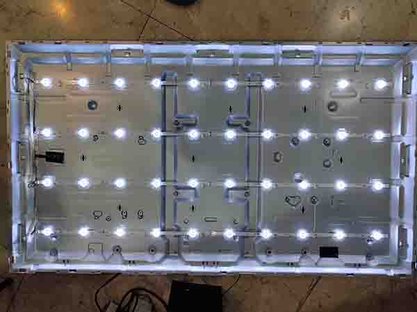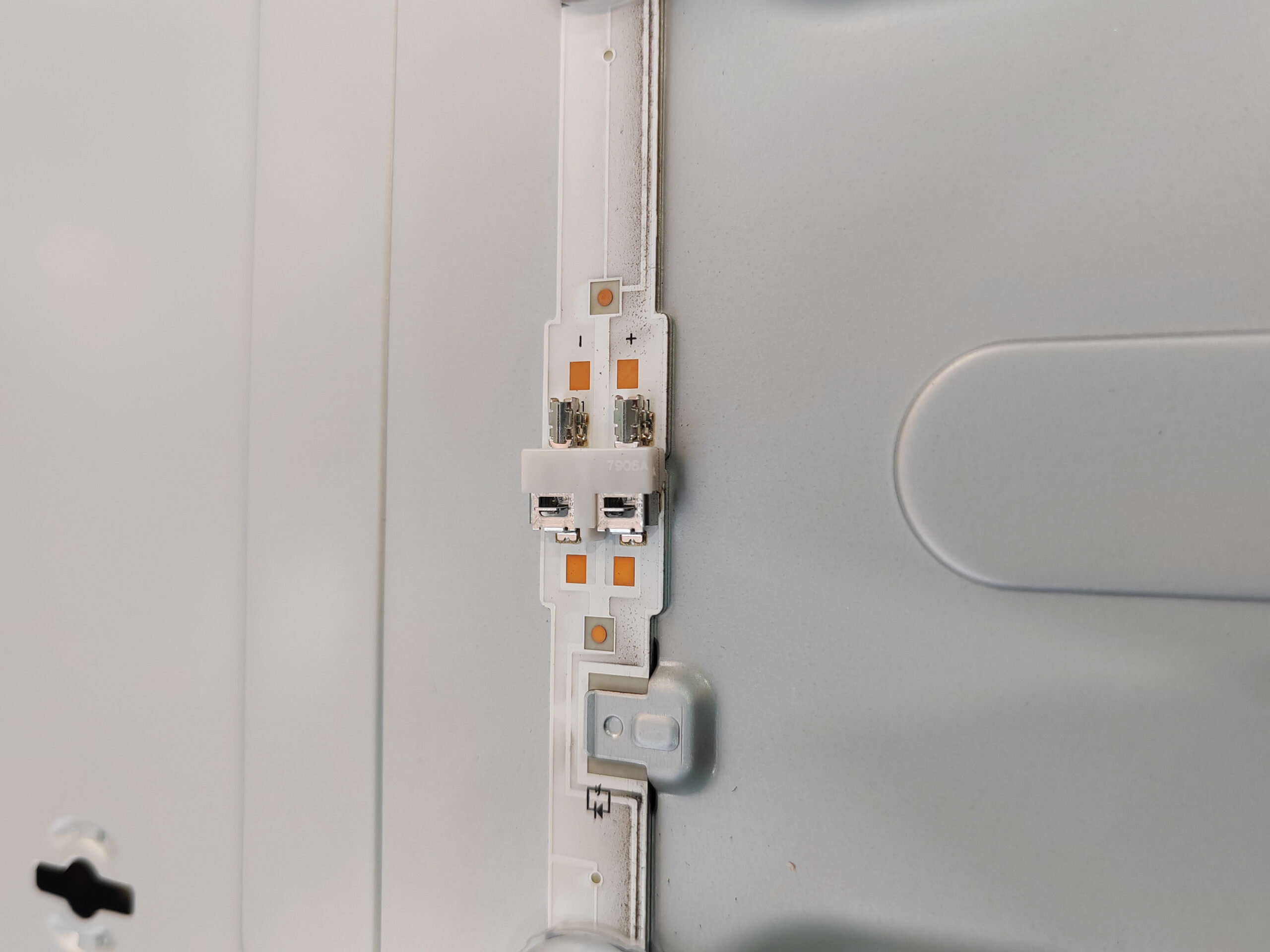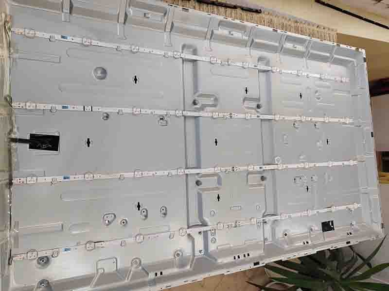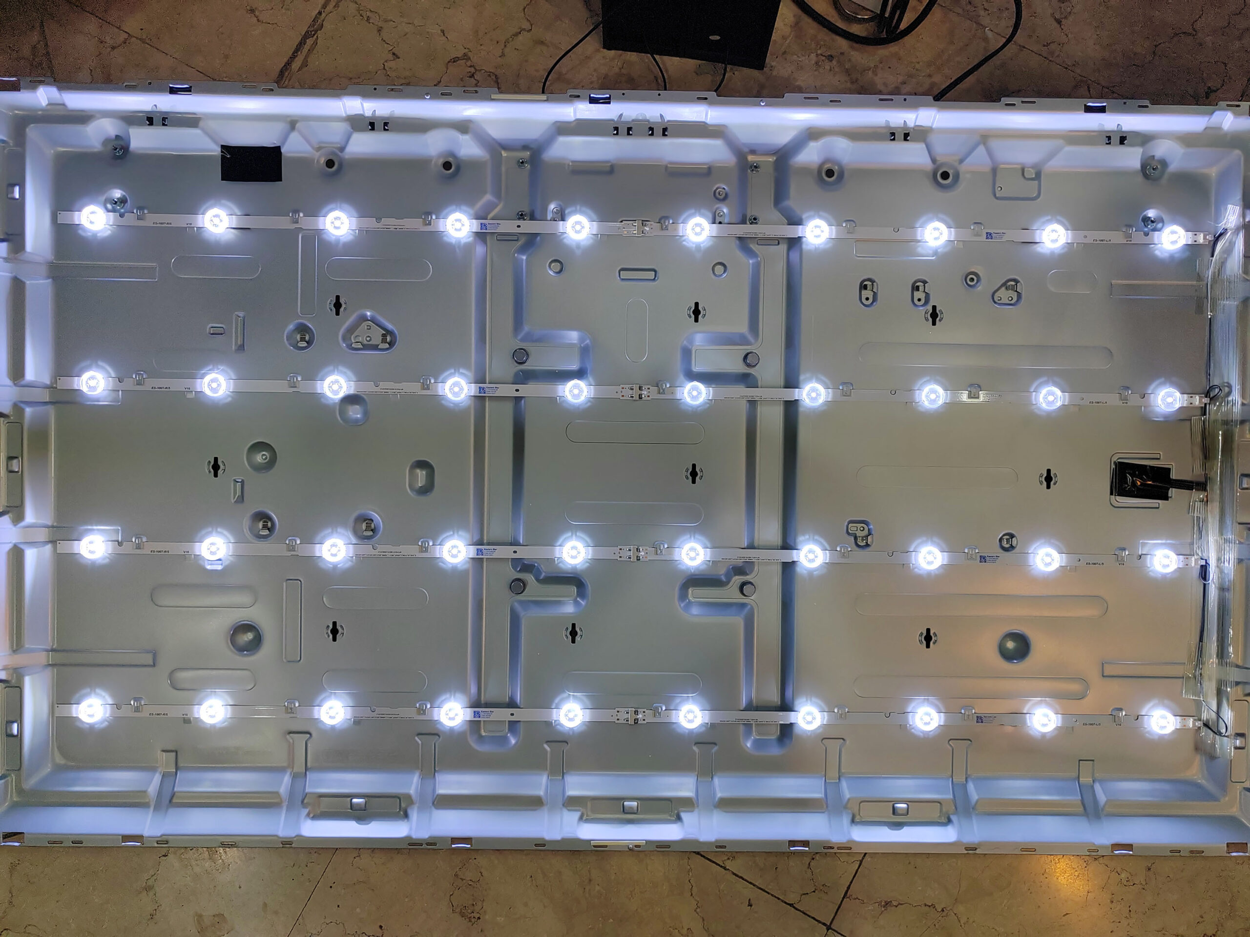 بکلایت ها در این مدل از وسط به هم وصل شدند و در کل شاسی هم زیر خارهای مخصوصی قرار دارد باید با حرکت بالا و پایین بکلایت ها رو رها کنید . دقت کنید سوکت های بکلایت پلاستیکی است و بعد سالها بسیار ضعیف و شکننده ، باید خیلی آرام و نرم سوکت برق بکلایت ها را رها سازی کنید . بعدش شاخه های بکلایت قدیمی را بردارید و جدید ها رو جایگذین کنید . بهتر است بکلایت ها اورجینال باشد تا چندین سال برای شما کار کند . مایل باشید می توانید بکلایت فابریک را از ما خریداری کنید . بکلایت ها رو که تعویض کردید باید سوکت های برق رو بزنید و تست بکلایت رو بگیرید اگر تمامی لامپ ها روشن شد و چند دقیقه هم صبر کنید و همه چیز اوکی بود می توانید پروسه جمع کردن دستگاه رو بر عکس باز کردن انجام دهید. بکلایت سامسونگ مدل UA49M5000AKXRQ از 4 شاخه اصلی که روی هر کدام 10 عدد لامپ ال ای دی LED قرار دارد تشکیل می شود . در ادامه تصاویر این مراحل قرار داده شده است .