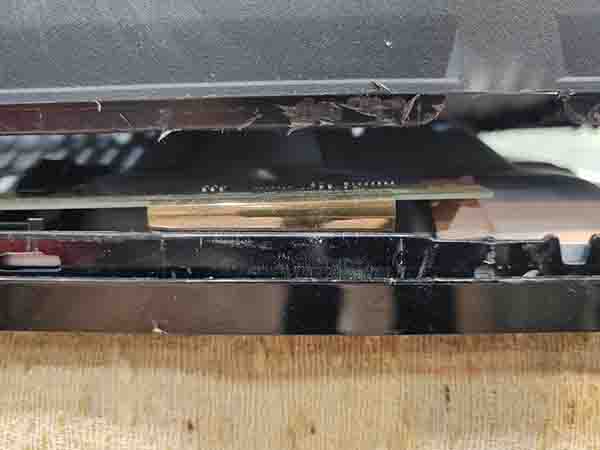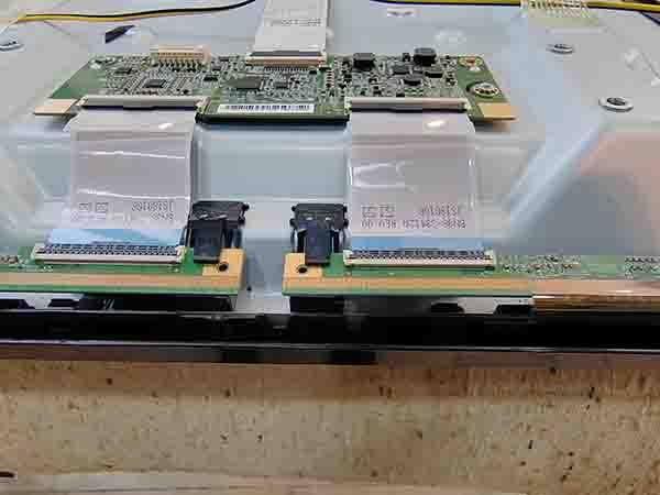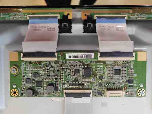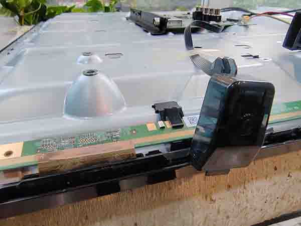 وقتی تمام خارهای دور تا دور دستگاه باز شود می توانید قاب پشت را بردارید . این مدل UA49M5000AKXRQ از سه برد : برد تغذیه ( پاور POWER) و برد اصلی مین ( MAIN BOARD ) و برد تیکان T-CON تشکیل شده . کافی است اتصالات لازم رو باز کنید( حتما فلتهای بین برد تیکان و آدرس برد را با احتیاط و آزاد کردن گیره ها بردارید . کنترل پنل ( همان قسمت مشکی که کلید روشن / خاموش شدن روی آن است را با احتیاط از قاب جلویی رها کنید و سوکت آن را از مین برد جدا کنید. حالا وقتش شده که بریم سراغ باز کردن پنل ، دستگاه را با آرامی و احتیاط برعکس کنید بطوری که شیشه رو به آسمان باشد . باید فریم جلو را با احتیاط از خارها آزاد کنید ، دقت کنید ممکنه چربی و آلودگی ها باعث چسبیدن فریم جلو به شیشه مخصوصا در قسمت پایینی شود . همه مراحل را آرام و آهسته انجام دهید . فریم را که برداشتید با ابزار هوا اندازی ، بین شیشه و زیرسازی هوا را وارد کنید تا برداشتن لیکوئید برای شما ساده تر شود