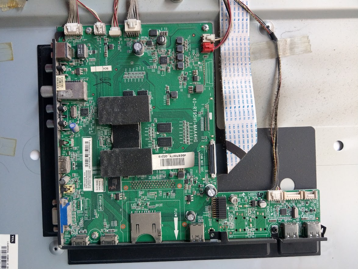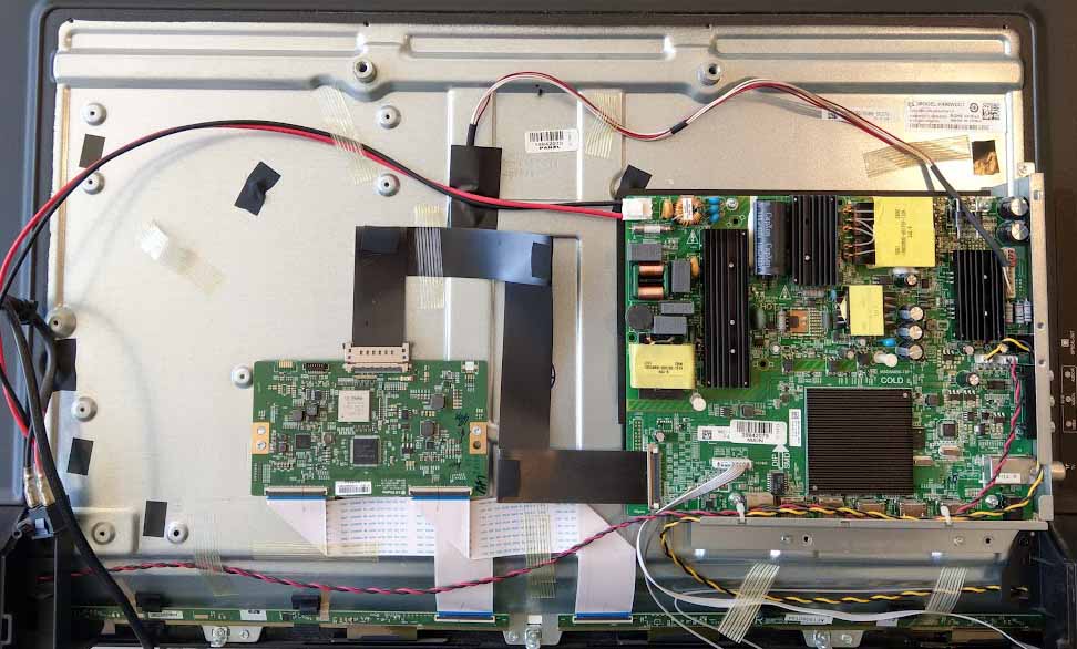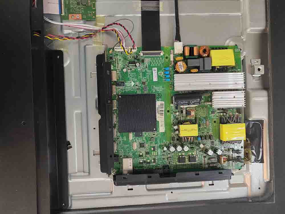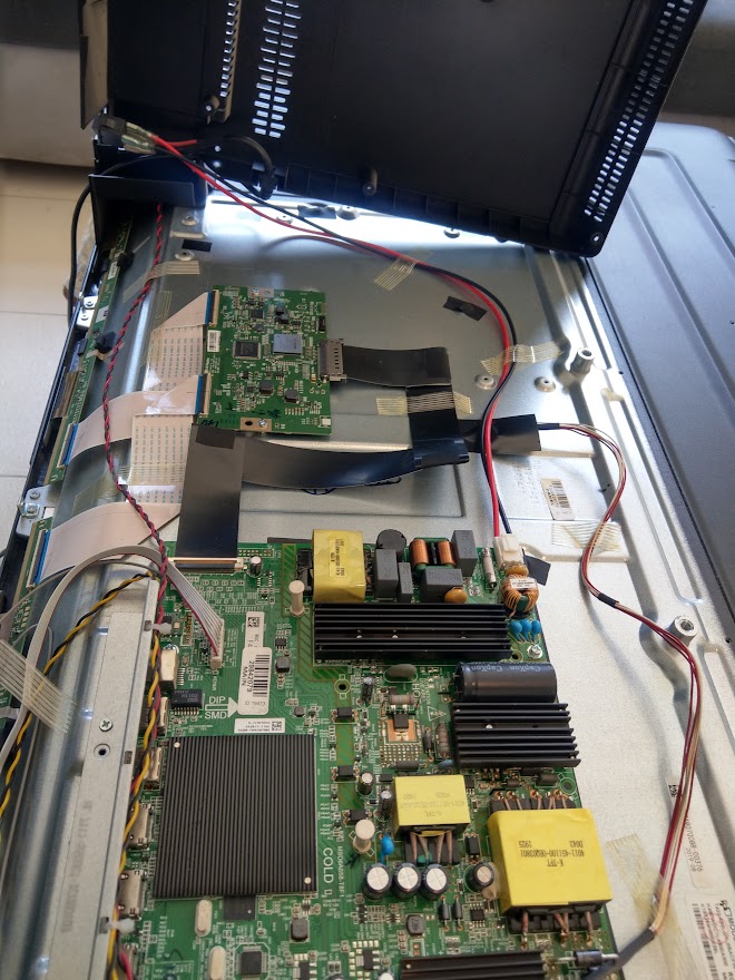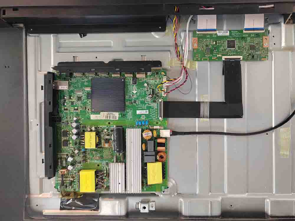 در این دو تصویر که بعد از باز کردن قاب پشت دستگاه تهیه شده است ، مشخص است که برد پاور / تغذیه / POWER SUPPLY به همراه برد اصلی مین MAIN BOARD بصورت مشترک روی یک فیبر طراحی شده است و تک برد است . فقط یک برد تیکان T-CON باقی می ماند که برعکس قدیم که محافظ فلزی داشت روی این مدل 50XCU635 با چسب پوشانده شده است و کابل LVDS از مین برد به تیکان وصل شده و از اونجا با کمک دو عدد فلت FLAT به آدرس برد می رود.