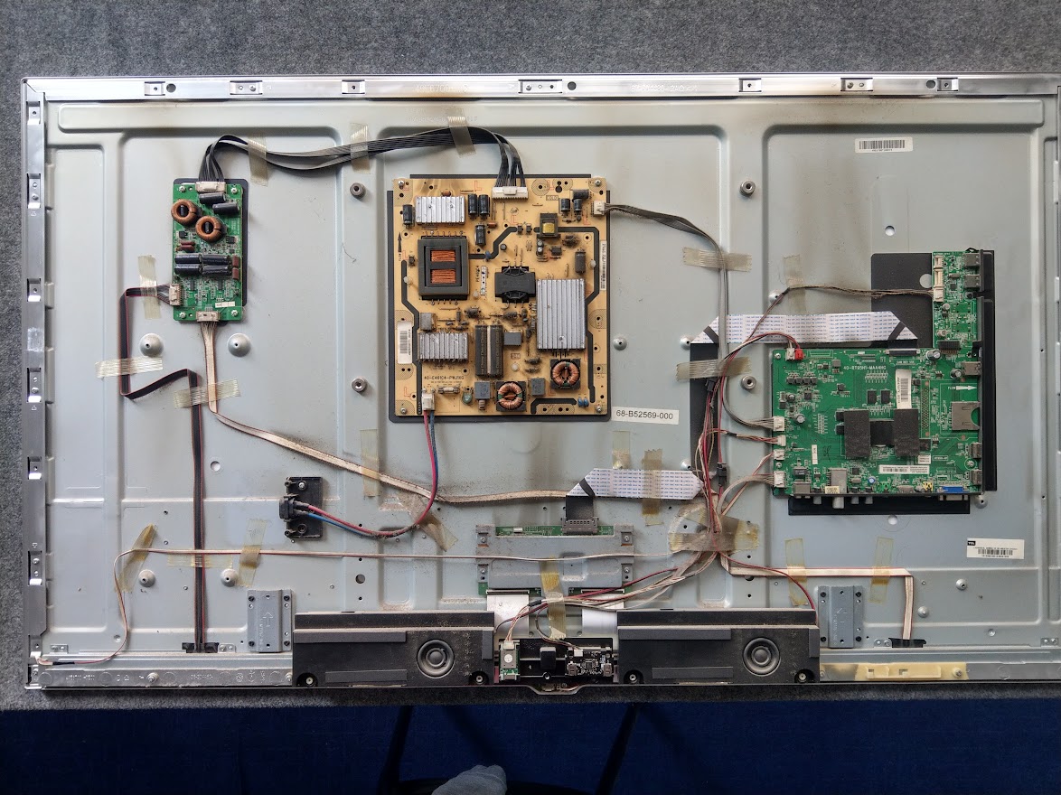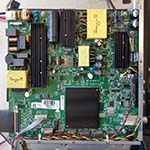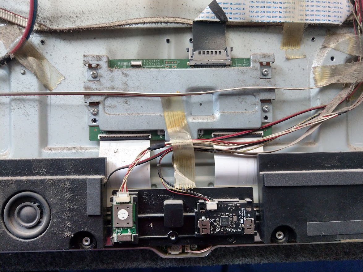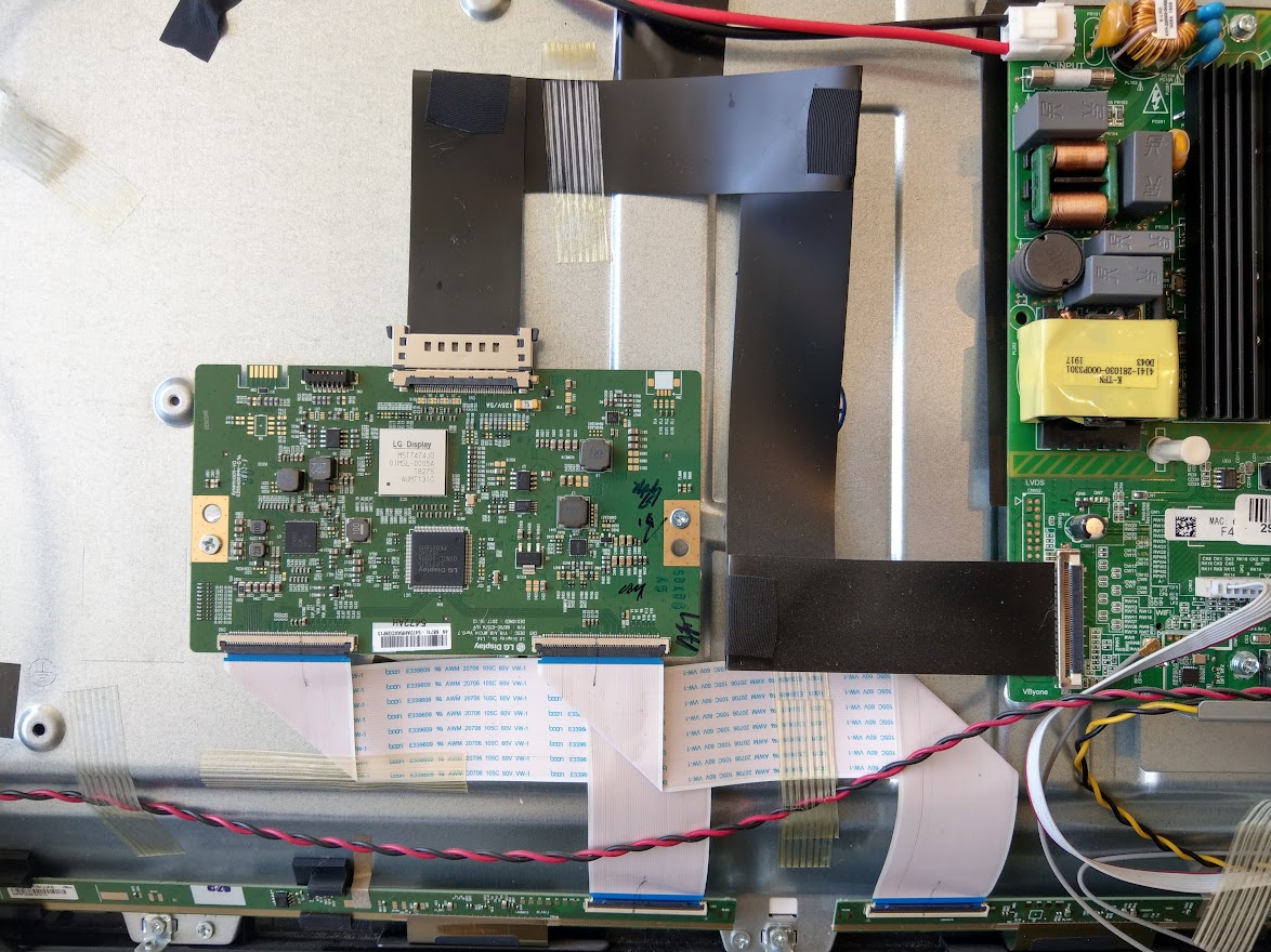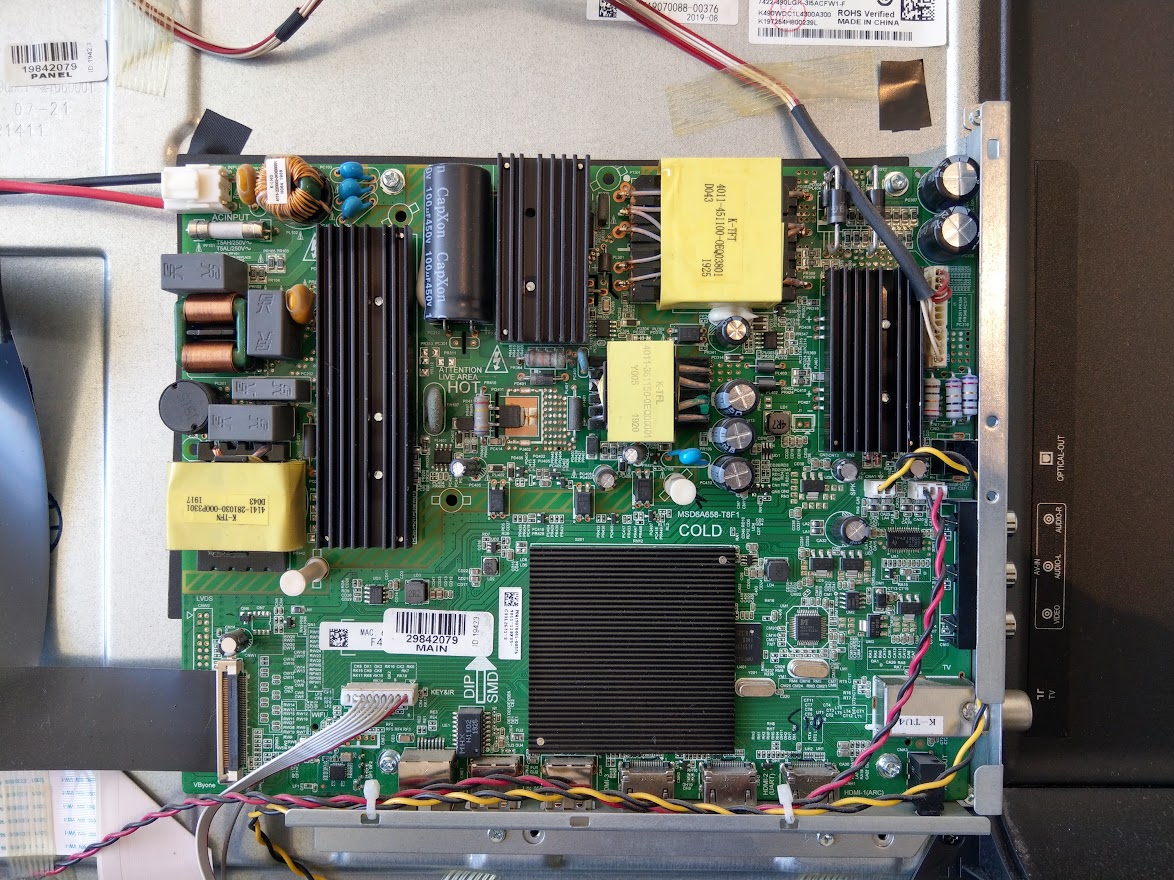 در این دو تصویر که بعد از باز کردن قاب پشت دستگاه تهیه شده است ، مشخص است که برد پاور / تغذیه / POWER SUPPLY به همراه برد اصلی مین MAIN BOARD بصورت مشترک روی یک فیبر طراحی شده است و تک برد است . فقط یک برد تیکان T-CON باقی می ماند که برعکس قدیم که محافظ فلزی داشت روی این مدل 50XCU635 با چسب پوشانده شده است و کابل LVDS از مین برد به تیکان وصل شده و از اونجا با کمک دو عدد فلت FLAT به آدرس برد می رود.