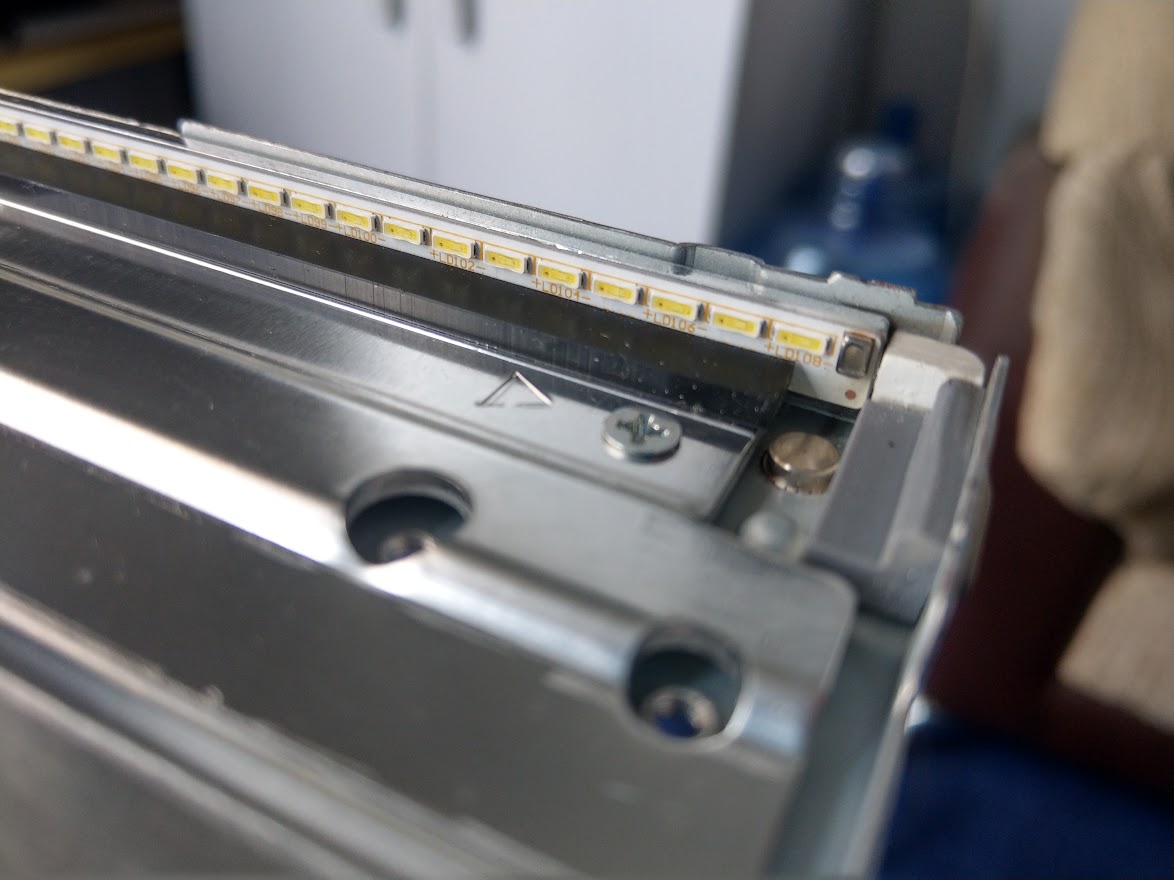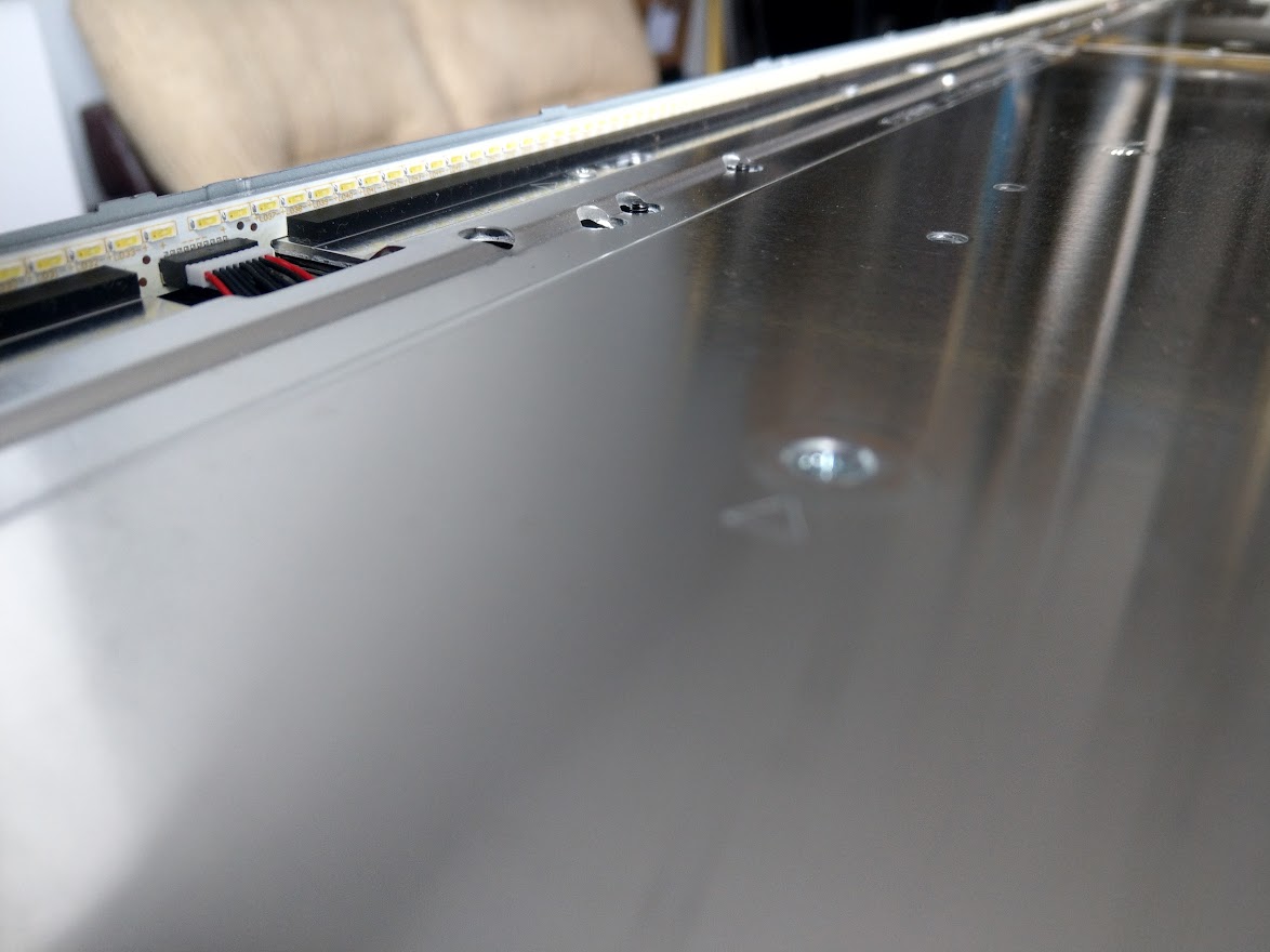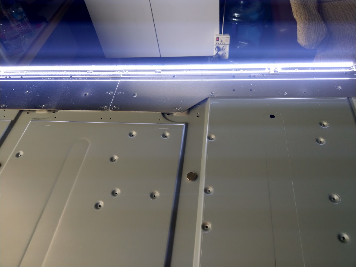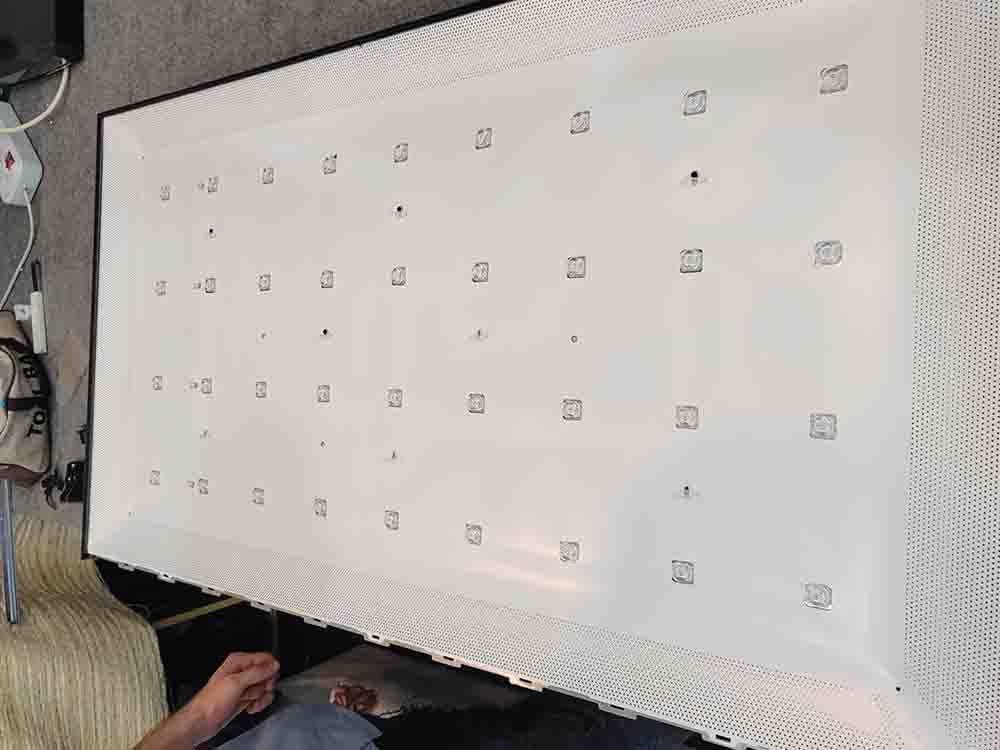 بعد از اینکه پنل و دیفیوزر ها رو برداشتیم ، با تصویر 7 روبرو می شویم ، نمایی از بکلایت ها که اول باید رفلکتور را که بصورت چسبی است باز کنیم و بعد می توانیم بکلایت دسترسی داشته باشیم . هولدرها بصورت پیچی است و از اینکه دیفیوزر شکم بدهد و به لامپ ها بچسبد یا موج در تصویر پیش نیاد استفاده می شود .
