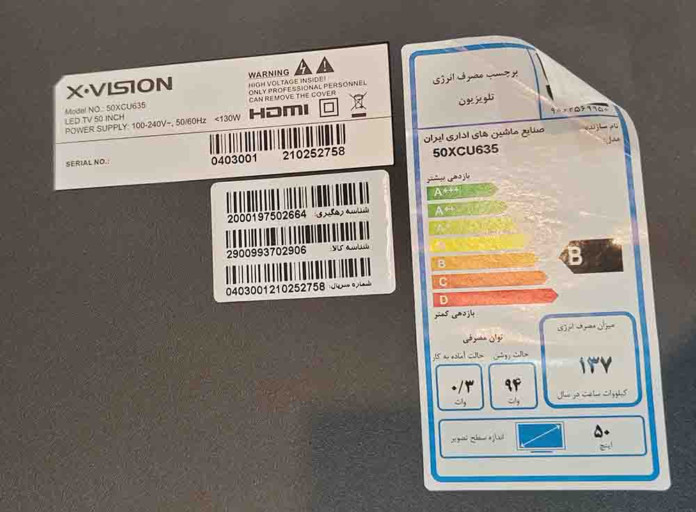 در دو تصویر سه و چهار از لیبل مدل و مشخثات و مصرف انرژی است . در تصویر شماره سه با برسی سریال گارانتی دستکاه در سایت اصلی مادیران میتوانید از زمان باقیمانده گارانتی تلویزیون خود مطلع شوید . در تصویر 4 هم در مورد میزان مصرف انرژی دستگاه اطلاعاتی دریافت می کنید .