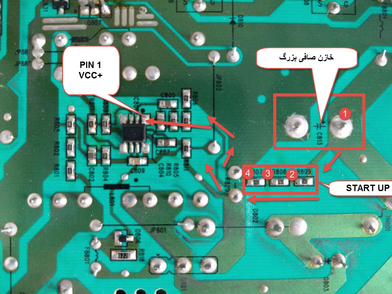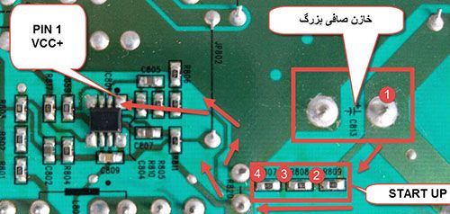 یکی از قسمت هایی که در بخش هات hot یا همان بخش ac برد های تغذیه باید برسی کنید ، وجود ولتاژ کافی برای شروع به کار آیسی 5501 که در اینجا نقش آیسی اصلی برای روشن شدن و شروع بکار بخش بکلایت را دارد ، میباشد . در ادامه سه تصویر از مدار run dc و START UP استارت آپ برای شما قرار میدهیم که بعد از عبور ولتاژ از پل دیود و قبل از رفتن به خازن صافی بزرگ و اصلی یک انشعاب از مسیر ولتاژ مثبت گرفته میشود و بعد از عبور از 3 مقاومت ولتاژ آن کاهش پیدا میکند تا برای VCC آیسی 5501 مورد استفاده قرار گیرد :