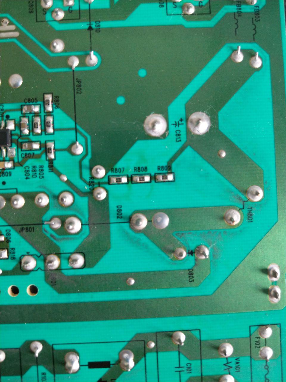 برای برسی بیشنر برد پاور را از تلویزیون جدا کردیم ، در خروجی کانکتور پاور به مین برد یک مقاومت یک کیلو اهم بین پایه استارت و گراند لحیم کردیم و پاور را به برق متصل کردیم ( نکته مهم : اگر به تعمیرات آشنایی ندارید به هیچ وجه این مراحل را انجام ندهید چون با برق مستقیم درتماس هستیم و بسیار خطرناک هست ) برای اینکه باید در خروجی پاور بار ( مصرف کننده ) وجود داشته باشد تا برد پاور تمامی ولتاژ های مورد نیاز در خروجی را تامین کند ، در غیر این صورت فقط ولتاژ 5 ولت استند بای را خواهید داشت ، در تست پاور POWER مشخص شد هیچ ولتاژی در خروجی نداریم و تمامی ولتاژ ها صفر هستند .