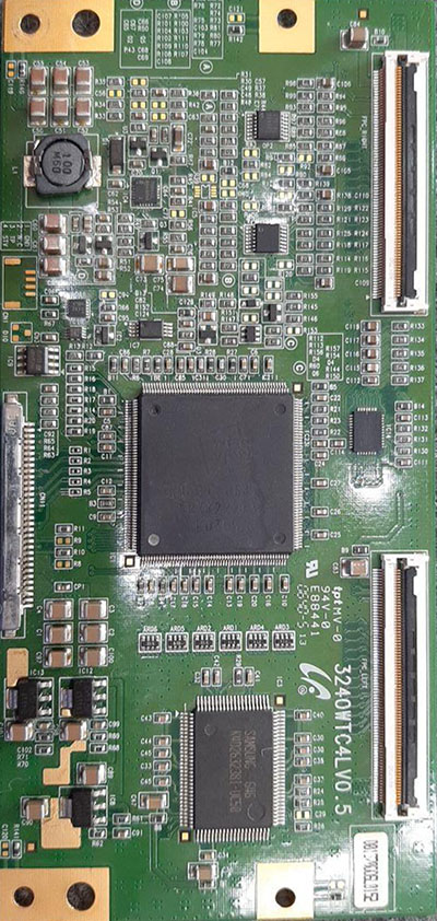 تلویزیون را از شاسی باز کردیم و به اینورتر رسیدیم ، تمام آیسی ها و فت ها و خازن های روی اینورتر سوخته بود ، مشخص بود بر اثر سوختن رگولاتورها جریان زیادی از برد کشیده شده و قطعات زیادی سوخته است.