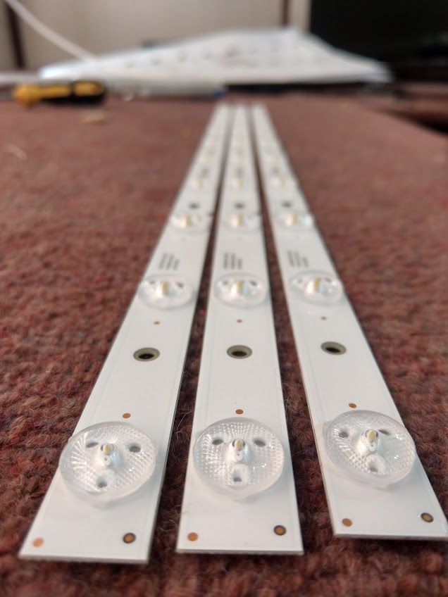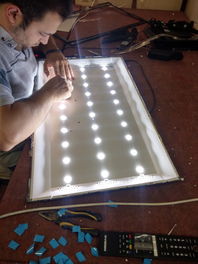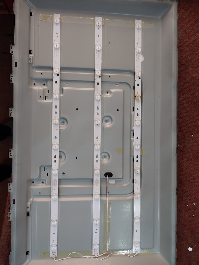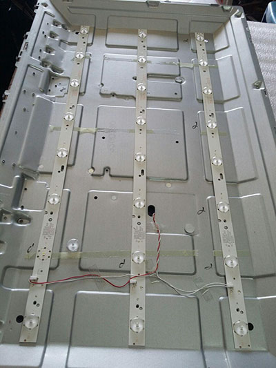 در تصویر زیر سینی بکلایت تلویزیون LED ایکسویژن مدل 32XS420 را مشاهده می کنید که بک لایت آن از نوع DIRECT یا مستقیم است که از سه ردیف که هر ردیف هم از 8 عدد لامپ LED تشکیل شده است و در تصویر میتوانید ببنید که یکی از انها در نوار LED بالایی سوخته بود که اگرمشتری درخواست تعمیر بدهد فقط همان یک LED تعویض می شود اما اگر با تعویض موافقت کند هز سه شاخه تعویض می گردد.