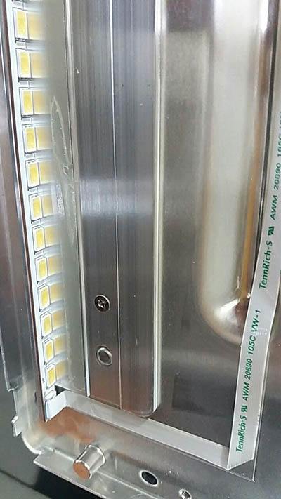 بعد از اینکه این آخرین لایه را برداشته باشید با تصویر زیر روبرو می شوید ، لامپ های ال ای دی را برای اینکه خنک شود روی بدنه استیل و فلزی نصب کرده اند که دما را بهتر به محیط انتقال دهد ،