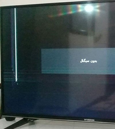 تصویر زیر نیز مربوط به تلویزیون LED ایکس ویژن XVISION مدل 43XT520 است که عزیزی با دفتر نمایندگی غرب تهران تماس گرفت و اعلام کرد از شهرک اندیشه تهران تماس میگیرد و یک دستگاه تلویزیون دارد که بر اثر پرتاب شدن اسباب بازی بچه تصویر سفید شده است و چند هط رنگی در تصویر دیده می شود.