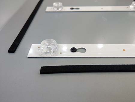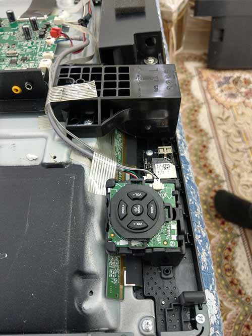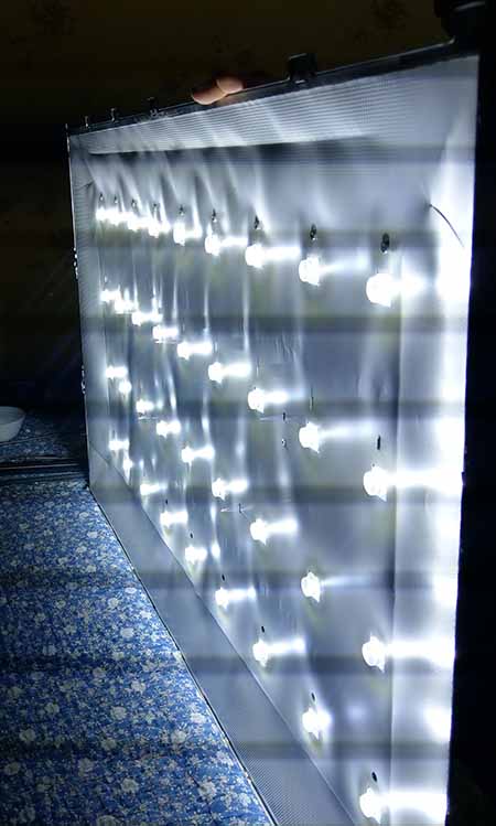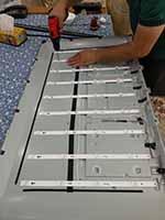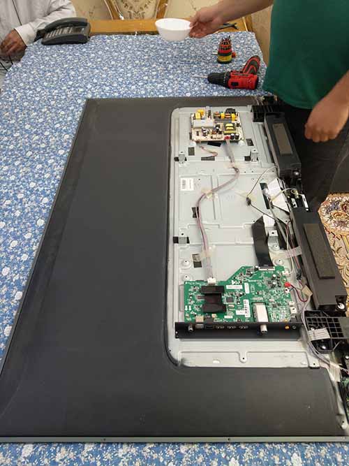 با تماس تلفنی آقایی از شهر رودهن ( بعد از پردیس از سمت شرق تهران ) و توضیح اینکه ایشان یک دستگاه تلویزیون led برند TCL از تولیدات شرکت مادیران ( تلویزیون تی سی ال TCL در ایران توسط شرکت مادیران و شرکت شهاب ، تولید و مونتاژ می شود ) به مدل 32D2910 دارند که متاسفانه دستگاه روشن می شود ولی تصویر دیده نمی شود اما صدای برنامه های تلویزیون شنیده می شود . با همین توضیح ایراد را بکلایت تشخیص دادیم و بعد از اینکه قیمت بکلایت فابریک و اورجینال را همراه با نمونه چینی موجود در بازار به مشتری اعلام و از مزایا و ایرادات هر دو و مدت زمان گارانتی و ضمانت آن شرح دادیم . ایشان هم با قیمت بکلایت فابریک موافقت کردند . به منزل ایشان ( در شهر رودهن - بومهن ) جهت تعویض بکلایت مراجعه کردیم . از یک میز برای باز کردن دستگا استفاده شد ، مدل 32D2910 از یک برد مشترک برای برد تغذیه پاور POWER BOARD 32D2910 و برد اصلی مین MAIN BOARD 32D2910 استفاده شده است . فریم دور دستگاه بدون پیچ است و با کمک ابزار باز می شود . بکلایت مدل 32D2910 از دو شاخه افقی که روی هر شاخه 6 عدد LED همراه با منشور استفاده شده است .