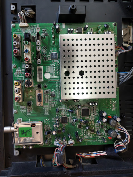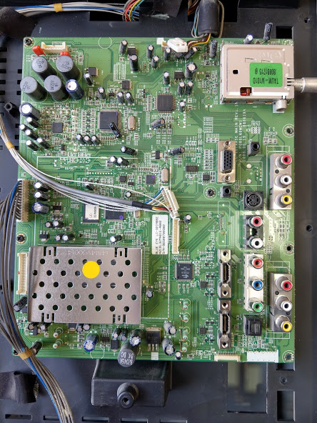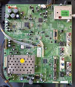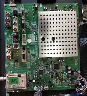 روی برد مین یک قسمتی است که با شیلد فلزی در عکس زیر هم مشخص است که البته باید با لحیم کاری باز شود و متاسفانه خیلی محکم هم به بدنه برد مین تلویزیون LCD متصل است و زمان زیادی و قلع زیادی لازم است تا بتوانید آن را باز کنید